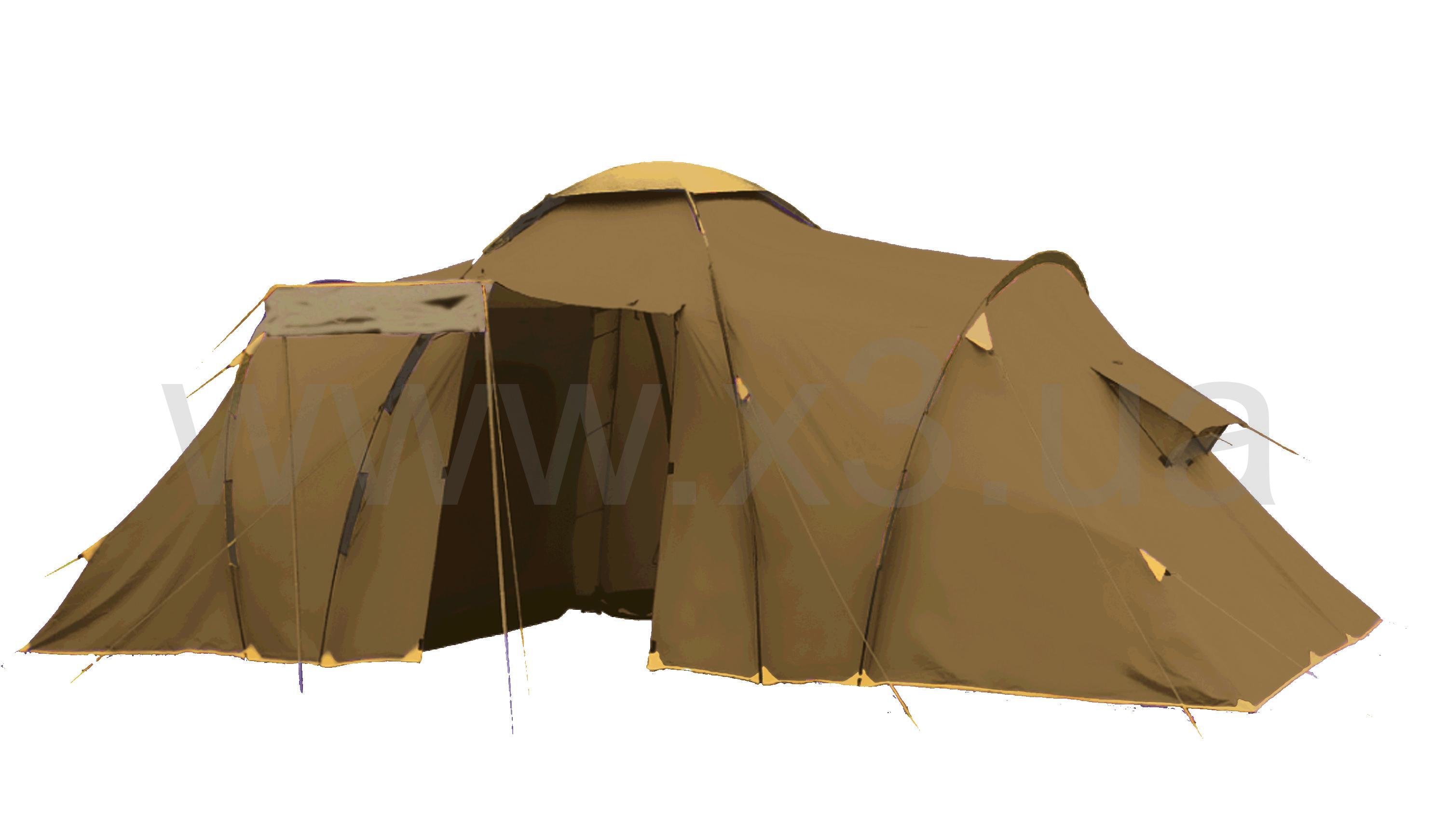 Двухслойная кемпинговая палатка, с двумя входами, большим тамбуром. Два спальных помещения, два больших вентиляционных окна, все швы палатки проклеены.