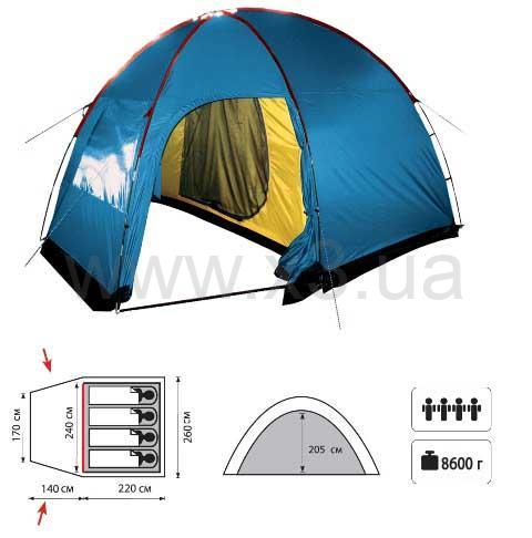 Тент палатки влагостойкий, с вентиляцией и окнами, обработан специальным составом, поглощающим ультрафиолетовые лучи, благодаря чему палатка практически не нагревается под палящим солнцем. Окна тента, в зависимости от погодных условий, можно открывать целиком, частично, или вовсе плотно закрыть в непогоду. Специальная пропитка, задерживающая распространение огня - залог безопасного соседства с костром. По нижней кромке тента пришита «юбка», которая препятствует попаданию воды и сквозняка к спальному отделению. Для надежной влагоустойчивости все швы тента и остальных частей палатки проклеены термоусадочной лентой