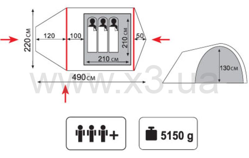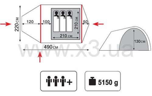 Двухслойная палатка с тремя входами. У палатки увеличенный тамбур с двумя входами. Палатка имеет 2 вентиляционных клапана с регулируемой по высоте стойкой. Все швы палатки проклеены.
