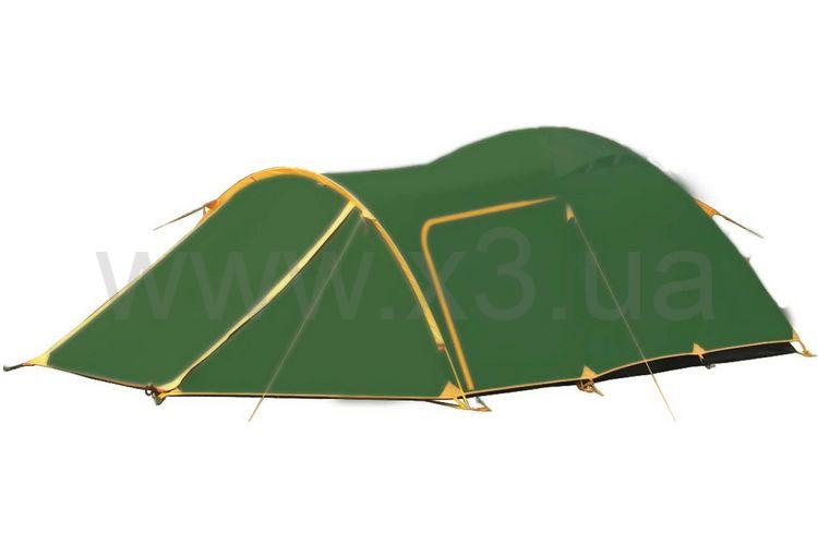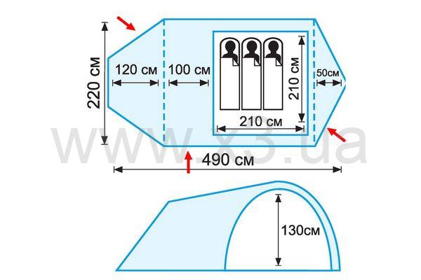 Двухслойная палатка с тремя входами. У палатки удлиненный тамбур с двумя входами. Палатка имеет 3 вентиляционных клапана с регулируемой по высоте стойкой. Все швы палатки проклеены.