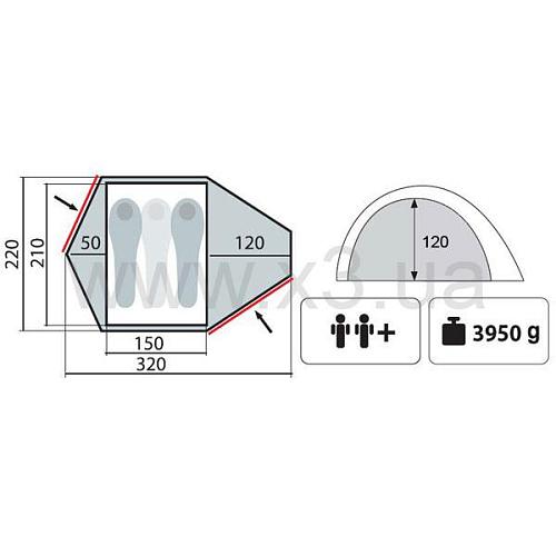 Двухслойная палатка с двумя входами. У палатки большой вместительный тамбур. Палатка имеет 2 вентиляционных клапана с регулируемой по высоте стойкой. Все швы палатки проклеены.