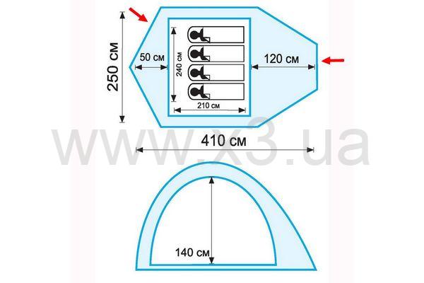 Двухслойная палатка с двумя входами. У палатки большой вместительный тамбур. Палатка имеет 2 вентиляционных клапана с регулируемой по высоте стойкой. Все швы палатки проклеены.