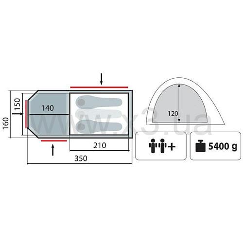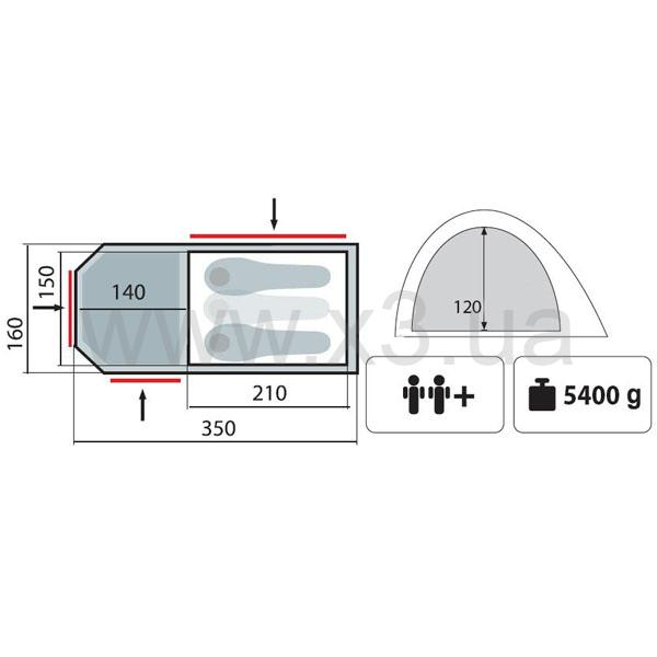 Двухслойная палатка с тремя входами. Палатка тоннельного типа с большим тамбуром. В жилом помещении оба входа снабжены москитными сетками. Все швы палатки проклеены. Палатка предназначена для туристических походов в весеннее, летнее и осеннее время.