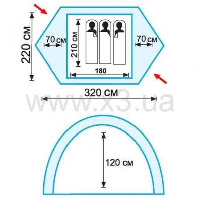 Двухслойная палатка с двумя входами. Палатка оборудована юбкой. Палатка имеет 2 вентиляционных клапана с двумя регулируемыми по высоте стойками. Все швы палатки проклеены.