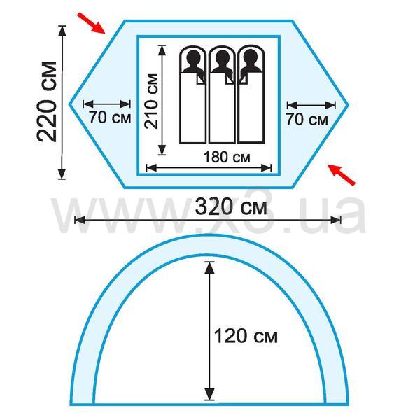 Двухслойная палатка с двумя входами. Палатка имеет 2 вентиляционных клапана с регулируемой по высоте стойкой. Все швы палатки проклеены.