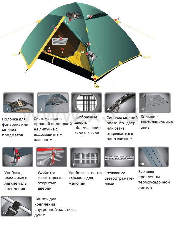 Туристическая палатка, способная разметить 4 человека. Дуги устанавливаются во внешние карманы тента. Оснащена палатка вместительным тамбуром, в котором можно сложить все свои вещи, будучи уверенным, что они не промокнуть во время дождя.
