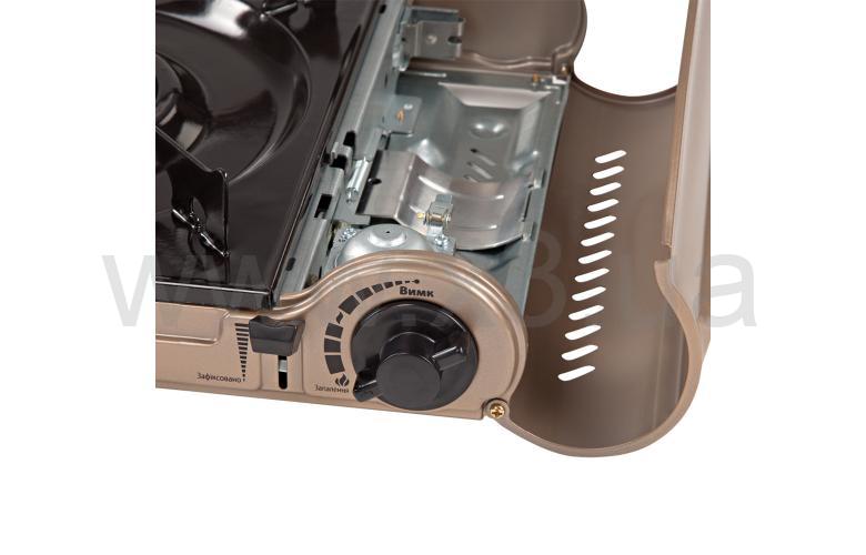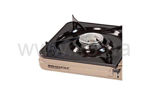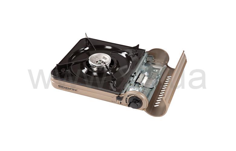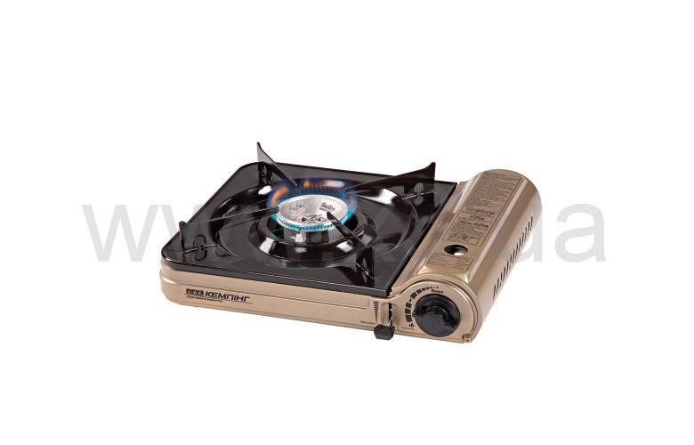 Одноконфорочная портативная газовая плитка с пъезоподжигом мощностью 2900 Вт, работает от одного газового баллона, помещённого внутри плиты.