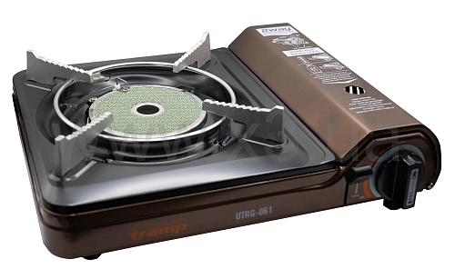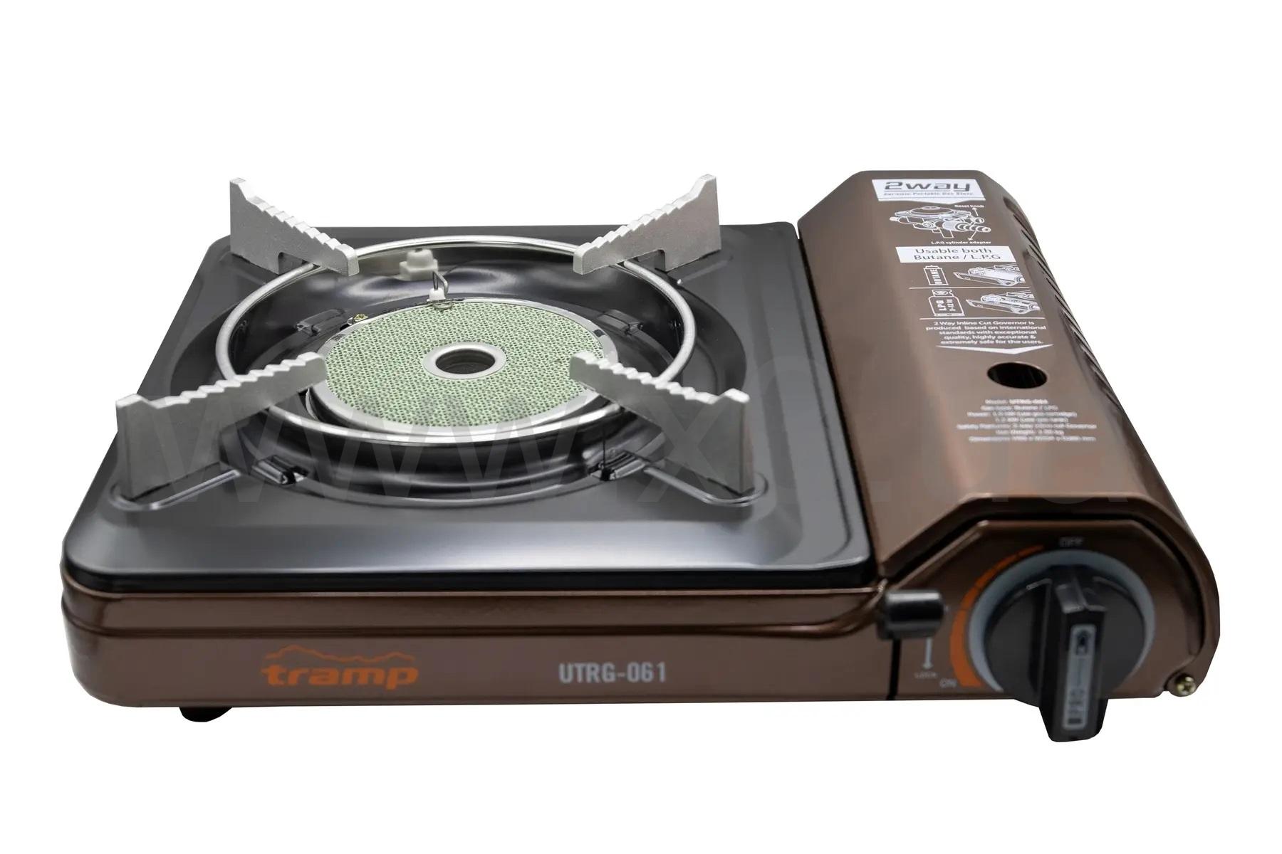 Компактная туристическая одноконфорочная газовая плита Tramp UTRG-061 с инфракрасной (практически без открытого пламени) керамической конфоркой и переходником на большой баллон.