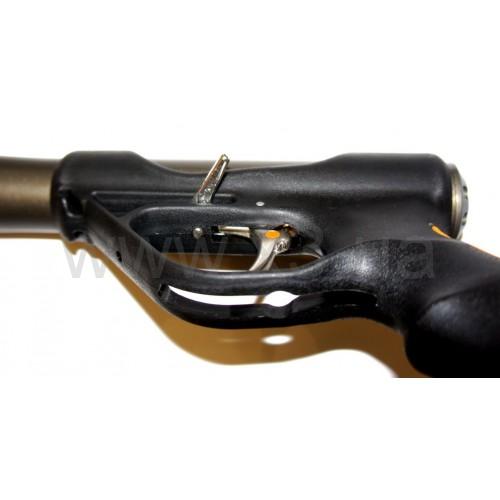 Главная особенность этого подводного ружья – это нержавеющие спусковой крючок и линесбрасыватель (две разные марки стали!). Спусковой крючок снабжён регулировкой свободного хода – по аналогии с пневматическим подводным ружьём Mares Cyrano Evo. Спусковой крючок выполнен из сверхпрочной стали 17-4PH (из той же марки Pelengas делает гарпуны), по достаточно сложной технологии, с толкателями. Коррозионная стойкость данной марки стали – на высшем уровне и приравнивается к пищевой нержавейке, но при этом твёрдость в два раза выше. При этом всё спусковой крючок очень лёгкий.