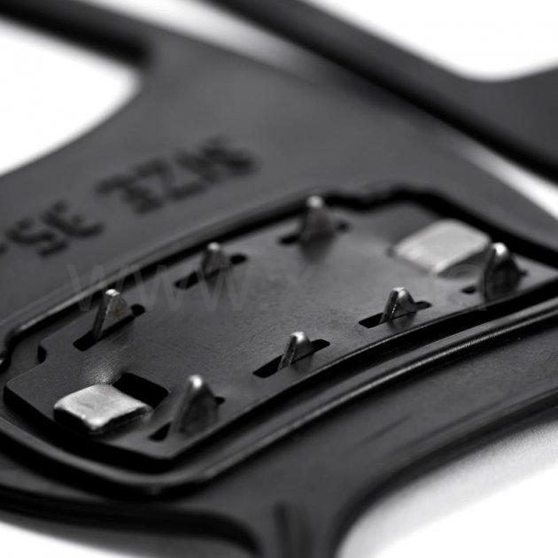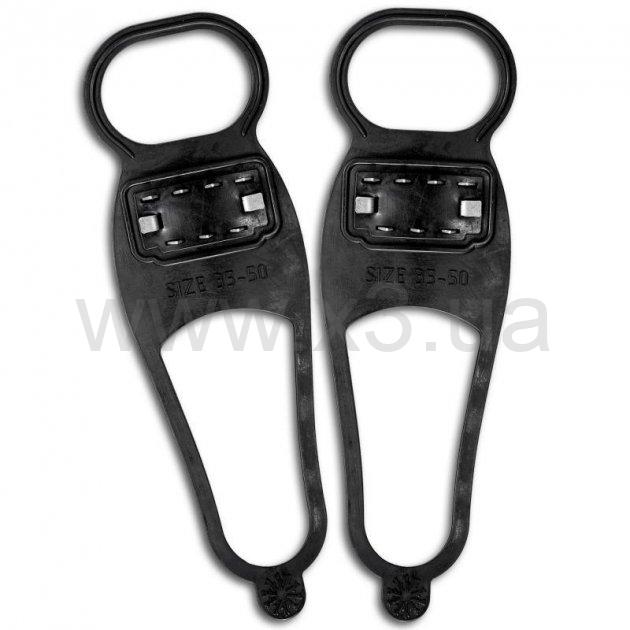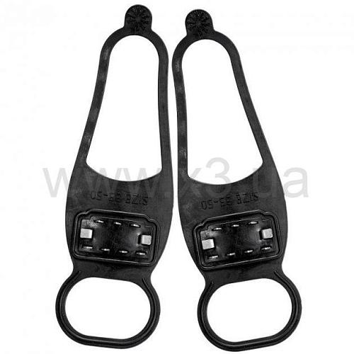 Противоскользящие накладки на обувь изготовлены из эластичной, прочной резины. Подходят к любому виду обуви и крепко к ней крепятся. Имеют 6 стальных шипов для большей защиты от падений.