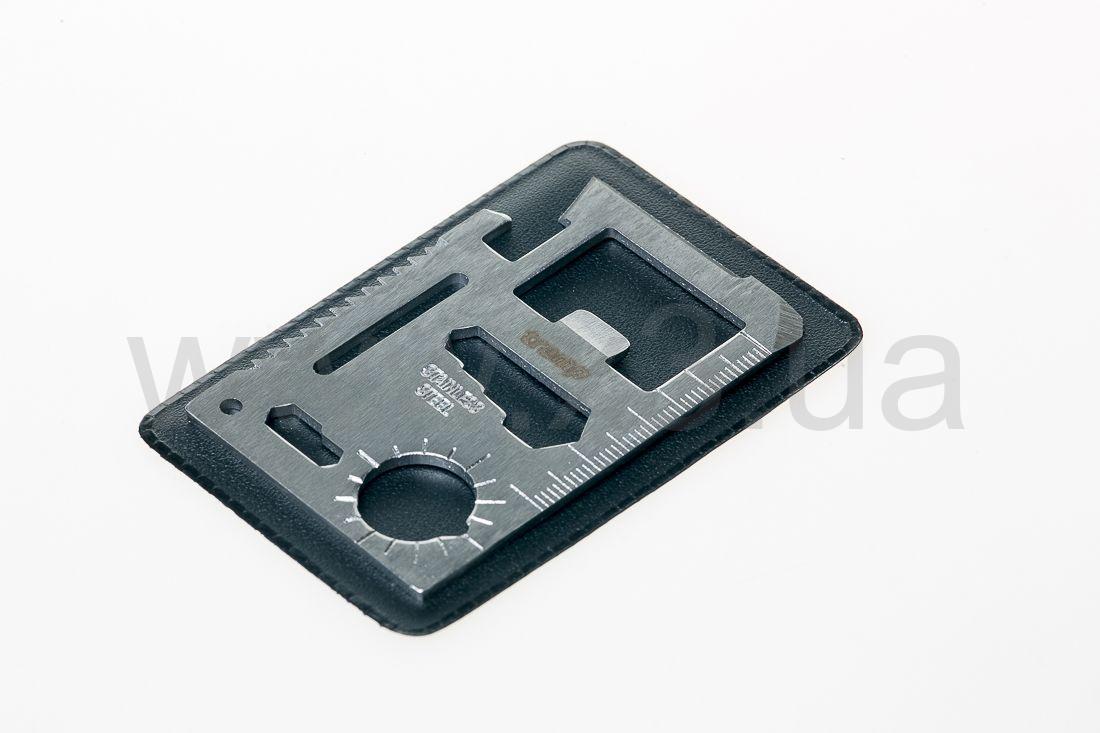 - при всей своей миниатюрности мультитул-карта гармонично соединила в себе одиннадцать разнообразных инструментов: консервный нож, ключ для открывания барашковых гаек, пила, отвертка плоская, отверстие в углу для гнутья проволоки или крепления карты к кольцу, гаечные рожковые ключи четырёх размеров, гаечные рожковые ключи двух размеров, линейка, транспортир на 16 направлений, открывалка для бутылок, боковой нож;