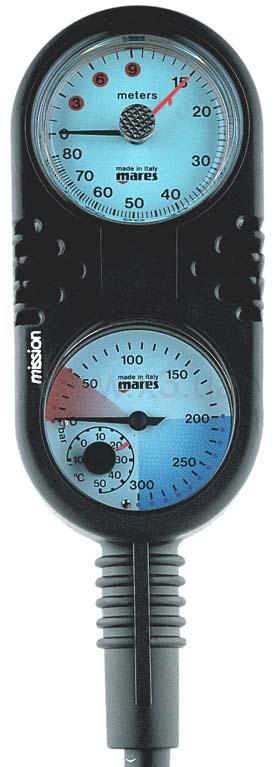 Комбинированный прибор, сочетающий в себе манометр и глубиномер (со шкалой на 300 или 450 бар). Корпус из противоударного эластомера.