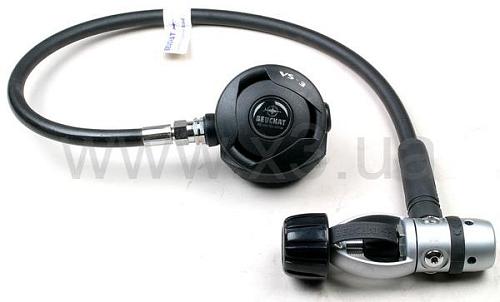 Один из самых простых и поэтому невероятно надёжный регулятор VS-3 подтверждает свои уникальные качества вот уже более десяти лет, на протяжении которых его конструкция доведена до совершенства. Изготовлен из высокопрочных легированных антикоррозионных материалов и состоит из первой ступени V-3 и дыхательного автомата VS. Редуктор поршневого типа понижает давление воздуха, поступающего из баллона, до установочного давления. Корпус второй ступени VS изготовлен из АВС-пластика, что обеспечивает максимум прочности при минимальном весе. Как управляющая мембрана, так и клапан выдоха выполняются из силикона для обеспечения легкого дыхания под водой. Три порта HP – высокого давления, один порт LP – низкого давления.