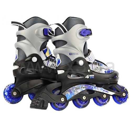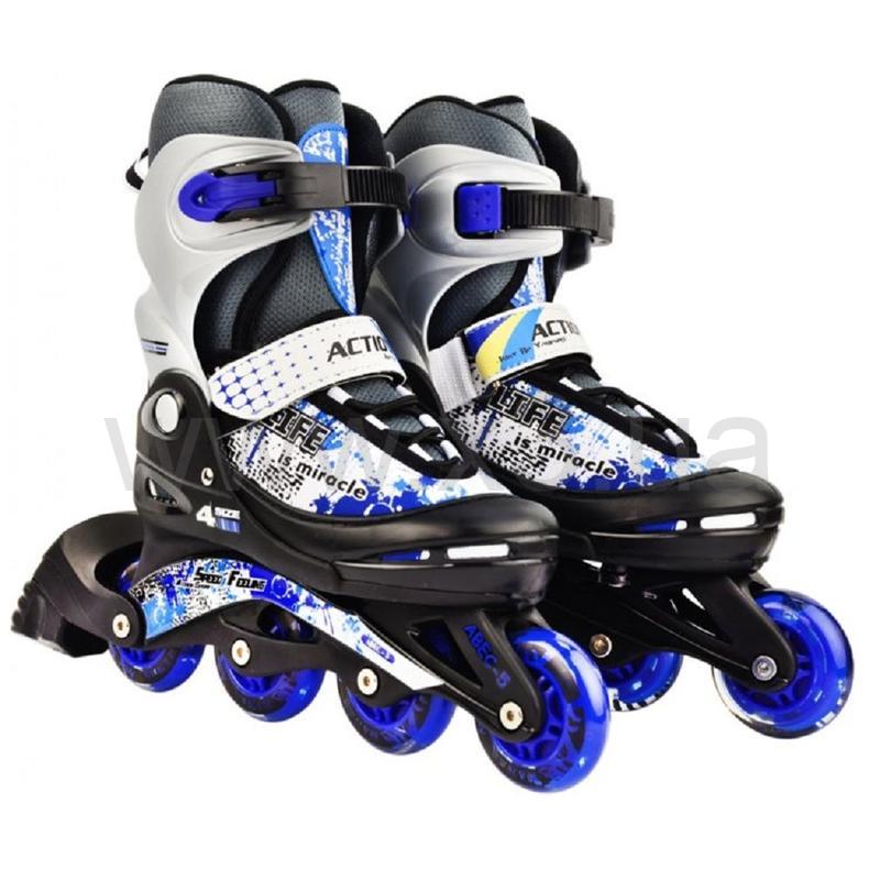 Action ZERO - набор, предназначенный для начинающих роллеров, отличный выбор для первых роликов. Дизайн модели выполнен в классических черном и светло-серых тонах с оригинальным синим принтом. Раздвижной внешний ботинок из полипропилена и мягкого нейлона надежно удерживает и защищает ногу от повреждений и возможных ударов. Быстрая система с одной кнопкой позволяет быстро отрегулировать размер в пределах 4-х доступных вариантов либо использовать коньки на вырост. Шнуровка ботинка укреплена ремешком-липучкой, а также двусторонней застежкой AUTO LOCK.
