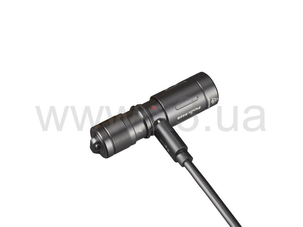 Модель Fenix E02R являет собой аккумуляторный прибор, который окажет пользу в качестве брелка на ключи. Одно из основных преимуществ фонаря – его компактные размеры. Весит он не более 15 грамм. Такой миниатюрный фонарик даёт световой поток в 200 люменов, а дистанция распространения луча достигает 49 метров. Функционирует со встроенным аккумулятором ёмкостью в 120 миллиампер-часов. Литий-полимерный аккумулятор обеспечивает работу фонарика, а освещение получается за счёт применения светодиода Cree XP-G2 S3. Освещение – белого цвета. Предусмотрен порт micro-USB для подзарядки аккумулятора.