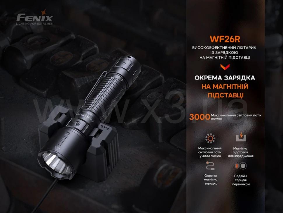 Фонарь Fenix WF26R, аккумулятор ARB-L21-5000 V2.0, подставка с магнитным кабелем для зарядки, запасное уплотнительное кольцо, темляк, руководство пользователя, гарантийный талон.
