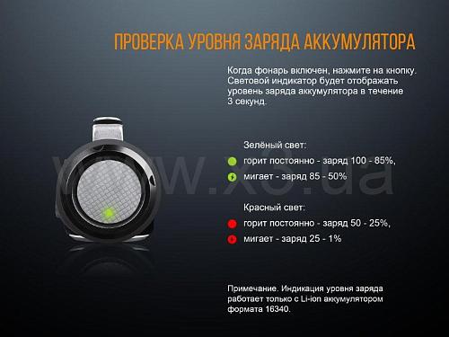 Комплектация: Фонарь, аккумулятор Fenix ARB-L16-700, USB кабель для зарядки, запасная резиновая накладка, запасное уплотнительное кольцо, чехол, инструкция, гарантия.