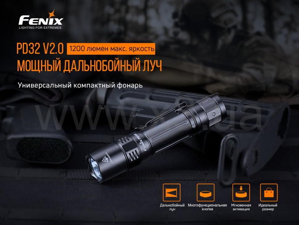 Усовершенствованная модель PD32 V2.0 – сочетание мощности, компактности, практичности и универсальности. Отличный вариант для EDC-использования за счет малого веса и небольших размеров. Он едва достигает 13 см в длину, имеет клипсу, за которую его можно удобно прикрепить на рюкзак, пояс или карман. Главное преимущество данной модификации – увеличение максимальной яркости света до 1200 люменов и дистанции луча до 395 метров.