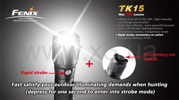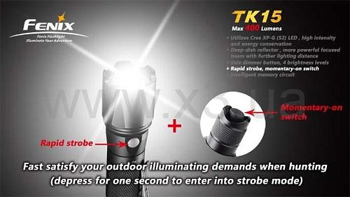 Fenix TK15 имеет функцию «запоминания» режима, который использовался в последний раз, и переходит на него при следующем включении фонаря. Глубокий отражатель делает фонарь довольно дальнобойным с отличной фокусировкой луча. Питание фонаря осуществляют две литиевые батарейки CR123A или одна литиево-ионная батарея 18650.