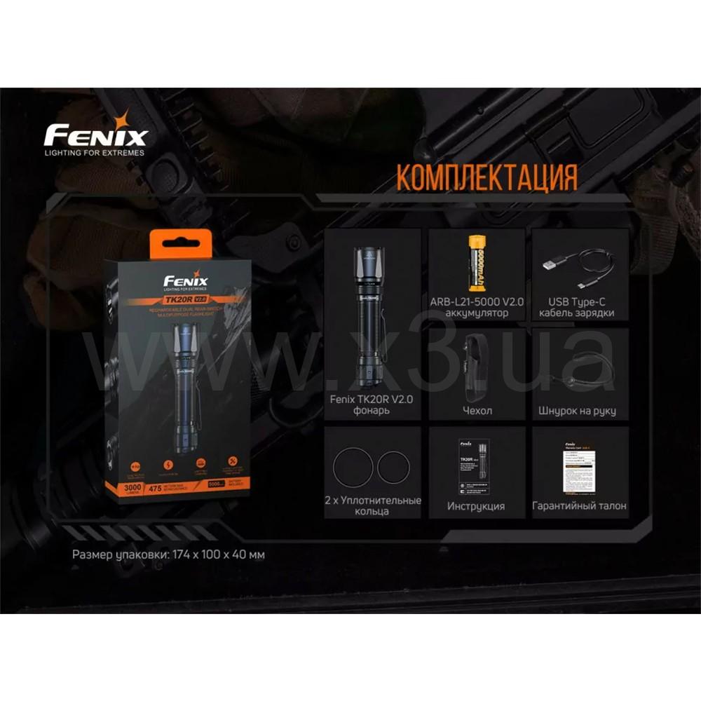 Комплектация: Фонарь модели Fenix TK20R V2.0, батарейка ARB-L21-5000 V2.0, кабель для зарядки USB Type-C, темляк, чехол, два запасных уплотнительных кольца, руководство к использованию, гарантийный талон.