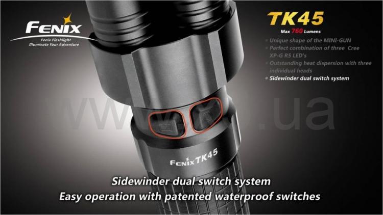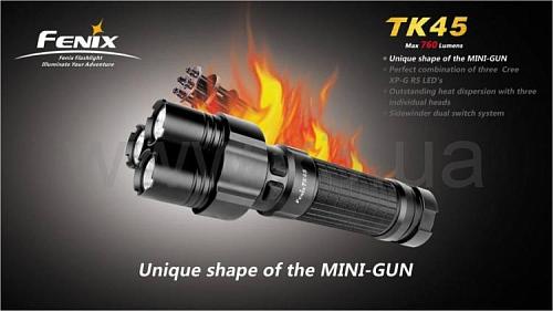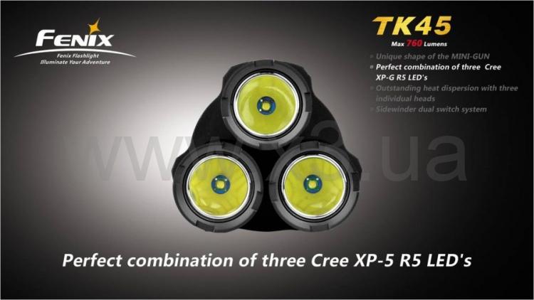 Фонарь Fenix TK45 обладает не только не стандартным дизайном, который больше напоминает пулемёт чем фонарик, а и очень мощным функционалом. Три головы фонаря, каждая из которых оснащена новейшим светодиодом Cree XP-G R5, суммарно дают 760 люмен, что в свою очередь делает этот фонарь одним из флагманов светодиодных фонарей.