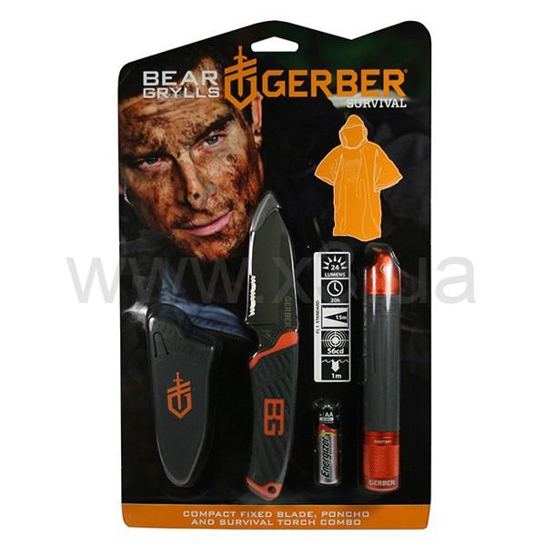 В набор входит: дождезащитное пончо нож и LED фонарик с водонепроницаемым отсеком для хранения аккумуляторов или спичек.