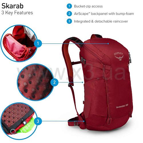 Простой и стильный мужской трекинговый рюкзак Osprey Skarab 22 с интуитивным дизайном идеально подходит для непродолжительных походов. Инновационная конструкция задней панели AirScapeТМ обеспечивает высокий уровень комфорта и эффективную вентиляцию, в то время, как удобные лямки и широкий набедренный пояс, способны отлично переносить и распределять нагрузку, когда рюкзак наполненный и тяжелый. Верхняя точка доступа на молнии обеспечивает быструю и простую упаковку/распаковку рюкзака. Кроме того, он оснащен отдельным отсеком со встроенным съемным рейнкавером, скрытым карманом для очков или телефона, внутренним сетчатым отделением для ценных вещей, а также многими полезными карманами и креплениями, предназначенными для необходимого в походе снаряжения.