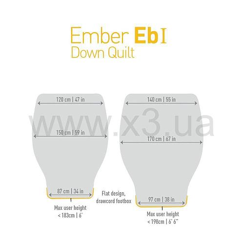Sea To Summit Ember Eb1 - спальник-квилт Sea To Summit из ультралегкой серии систем для сна, представляющий собой пуховое одеяло, которое в сочетании с теплым ковриком дает отличную возможность сэкономить в весе без ущерба комфорта сна в условиях дикой природы. Кроме того, такой пуховый квилт можно использовать в качестве дополнительного слоя утеплителя в стандартный спальник, если предстоит путешествие в холодное время года. Серия Ember может использоваться в нескольких конфигурациях. Самый простой способ применения - плед или одеяло, если вы не любите скованности классического спальника. В прохладную погоду можно затянуть или состегнуть нижнюю часть квилта и сформировать своеобразный бокс для ног. Такая конструкция идеально подходит для использования с теплым надувным ковриком Sea To Summit. Для надежного соединения с ковриком есть соответствующие затяжки и фиксаторы.