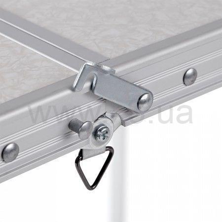 Столешница из ламинированного ДВП. Чтобы две половины столешницы надёжно держались, они скреплены специальным крючком. Для того чтобы стол мог выдерживать большую нагрузку и сохранять целостность, низ столешницы усилен ребрами жесткости.